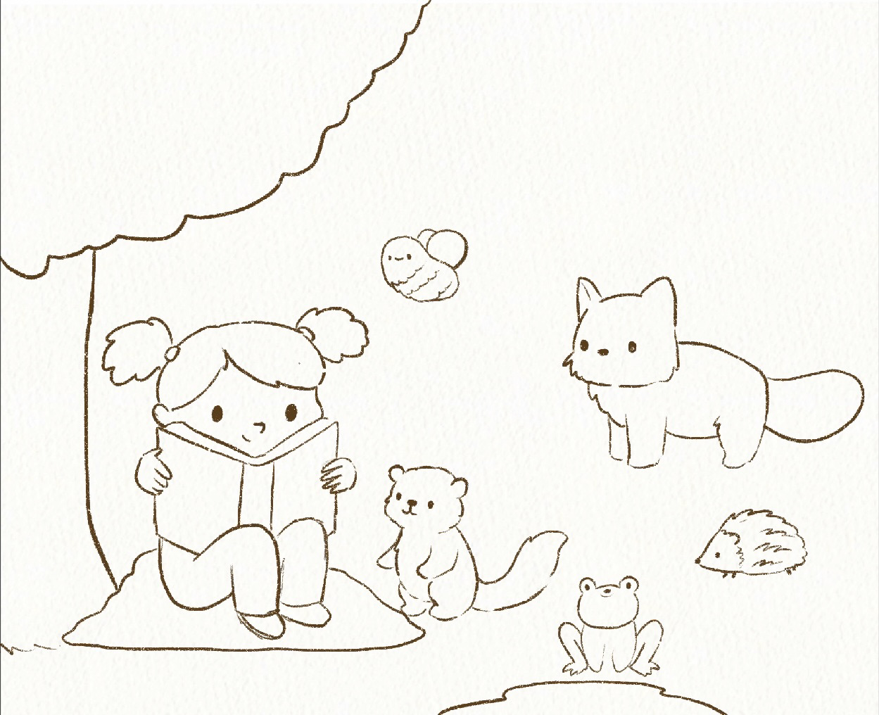 I wanted to draw this cute little girl reading stories to the forest animls. This is for a personal project and to experiment a bit